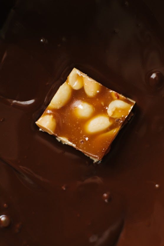 Set aside on a sheet tray lined with parchment. Place the candy bars in the refrigerator to set up.